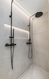 Matte, lyse fliser legger grunnlaget for uttrykket på baderommene, og spiler på både vegg og møbler skaper en behagelig kontrast i rommet. Detaljer i sort matt setter også et moderne preg på badene, og den tidsriktige overflaten er valgt på alt fra armaturer og tilbehør, til vegghengt toalett.